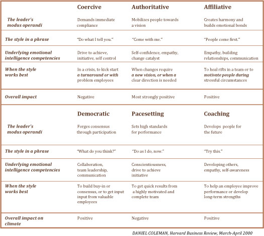 Leaders can choose from six identified styles of leadership: coercive, authoritative, affiliative, democratic, pacesetting and coaching. (view chart below)
